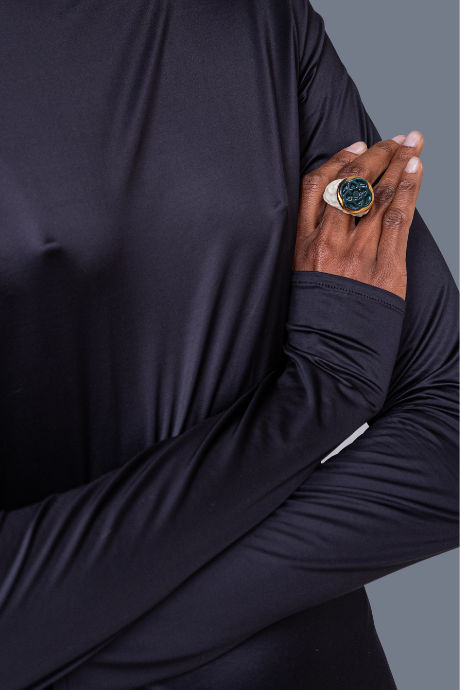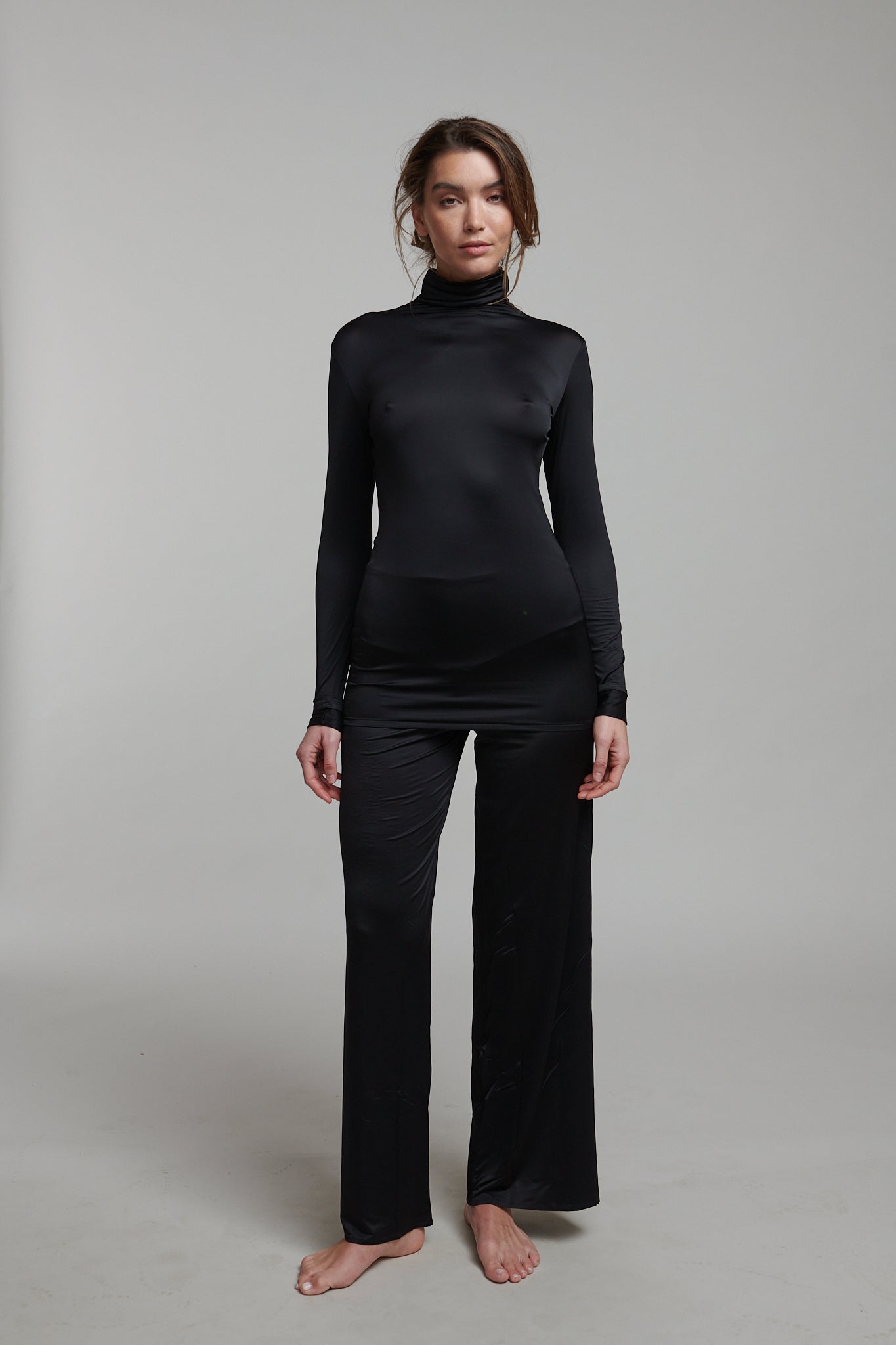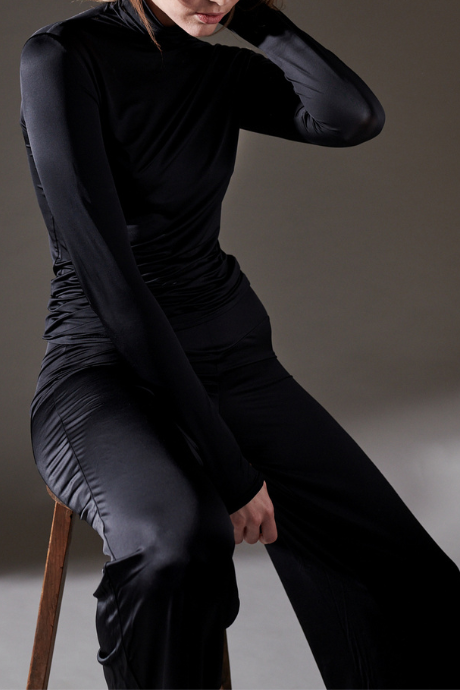 Its body-hugging fit follows the form without restriction, creating a clean, smooth line under knits, tailoring, or worn on its own.