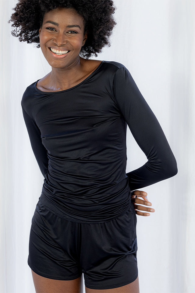 Frances long-sleeved top with slitz on the sleeve side seam for your thumb: Your Ultimate Comfort Essential!