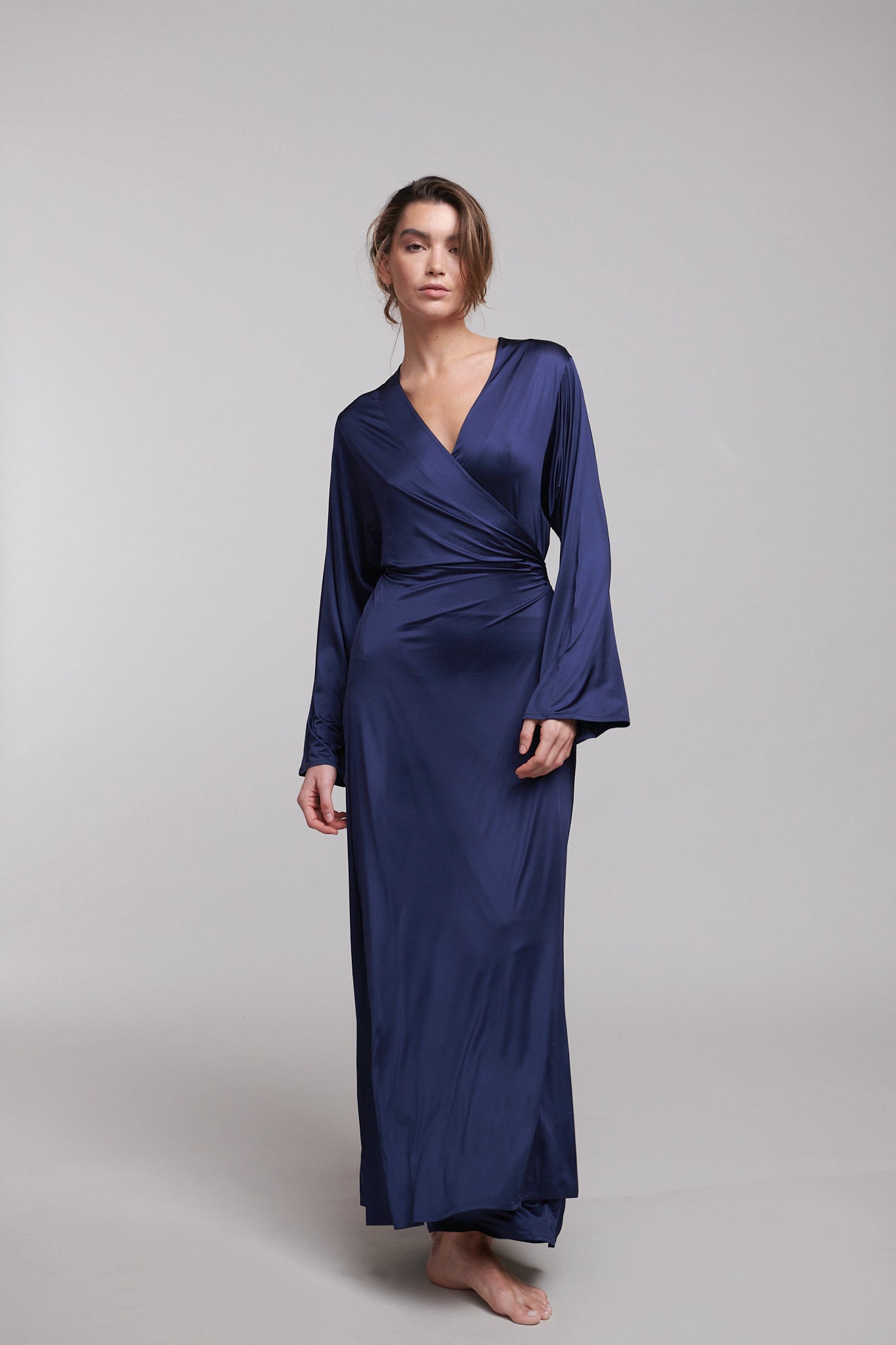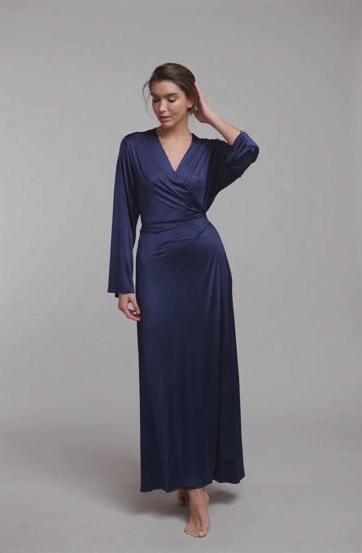 Zoe Maxi Dress is versatile and sublime with its silky, flowing smoothness. Femininity and sensual ease wore day into night. Fabric is so comfortable and soft, it feels like a second skin. Wear it as a long wrap dress, a lounging robe, or over one of our mini dresses.