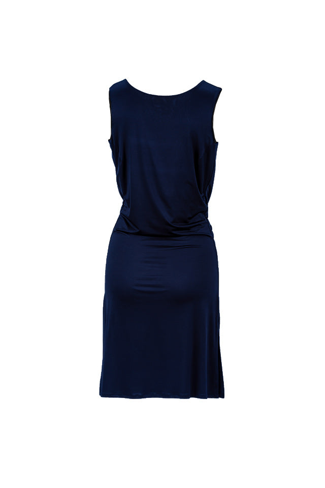 The reversible neckline is either scooped or a higher sophisticated look. The colors reverse inside out from black to deep-sea blue or black to champagne. Designed with slits on both sides for freedom of movement.